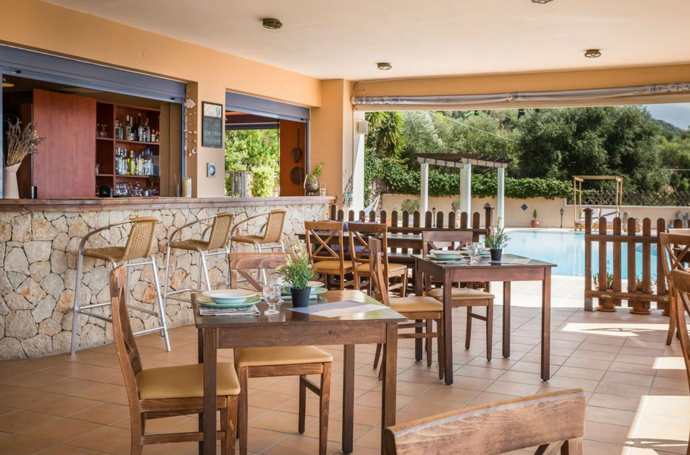 The accommodation provides guests with delightful dining options like breakfast, light meals and snacks in a romantic setting by the pool, enjoying the stunning combination of lush greenery and the azure waters of the Ionian Sea.